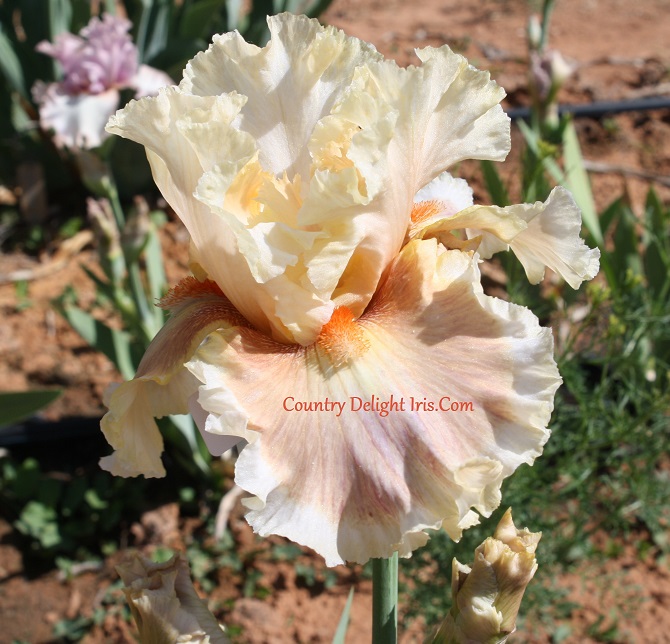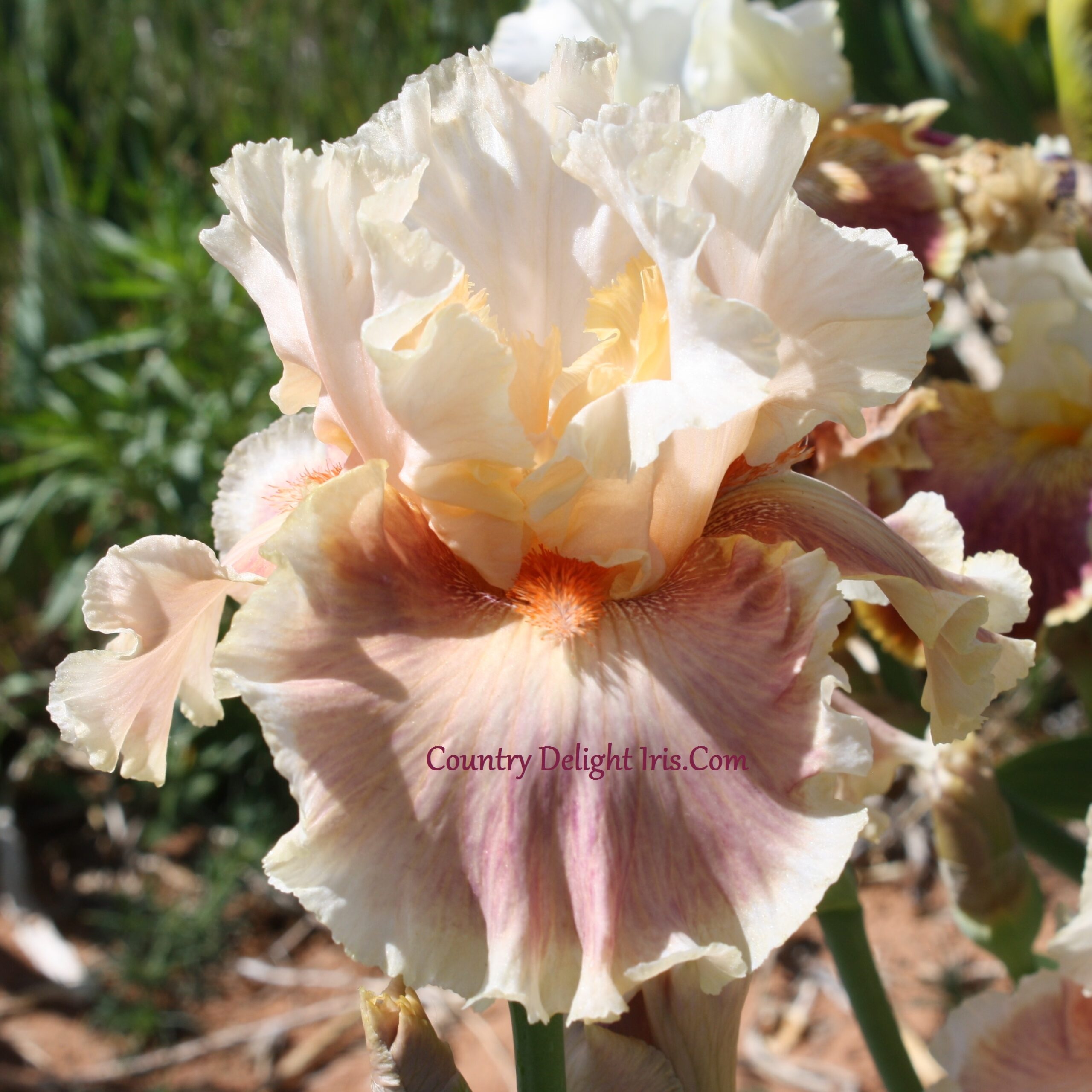 ‘Apricot Smoothie’ (Thomas Johnson, R. 2018). TB, 34″ (86 cm). Midseason bloom. Standards cream, deep apricot in center; style arms peach; falls large peach spot overlaid and washed deep rose, cream band edged light peach; beards bright red-orange; slight fragrance. Mid-America 2018. Honorable Mention 2021.