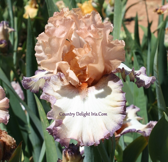 ‘Beautician’ (Thomas Johnson, R. 2019). TB, 36″ (91 cm). Midseason to late bloom. Standards and style arms pink; falls light pink to white ground, lavender stitched plicata band; beards orange, tips white; slight fragrance. Mid-America 2019. Honorable Mention 2021.