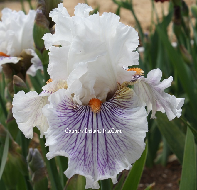 ‘Berserk’ (Thomas Johnson, R. 2013)  TB, 30″ (76 cm). Midseason bloom. Standards and style arms white; falls violet veins radiating from center on white ground ending with precise white band; beards orange; slight fragrance. Introduced by Mid-America 2015Honorable Mention 2016Award of Merit 2018.