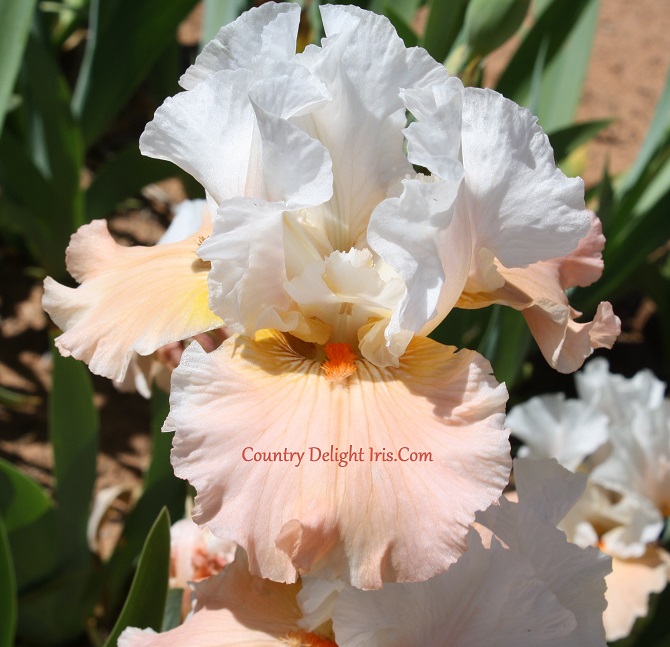 ‘Betty Dunn’ (O. David Niswonger, R. 1995). TB, 33″ (84 cm), Midseason bloom. Standards near-white, slight pink basal flush; style arms white, pink center streak; falls salmon pink, white rim; beards tangerine. Cape Iris 1995. Honorable Mention 1998.