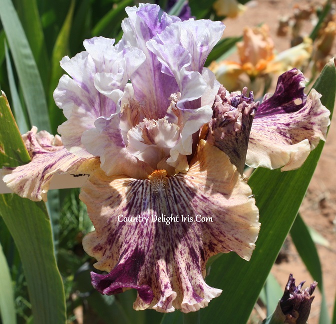 ‘Break In’ (Paul Black, R. 2019). TB, 37″ (94 cm). Midseason to late bloom. Standards white randomly splashed mid red-violet; style arms palest lilac, laced crests streaked mid brown; falls white center to mid cantalope, center randomly lined, sanded and streaked mid red-purple; beards based white, tips tangerine; slight musky fragrance. Mid-America 2019. Honorable Mention, 2023.