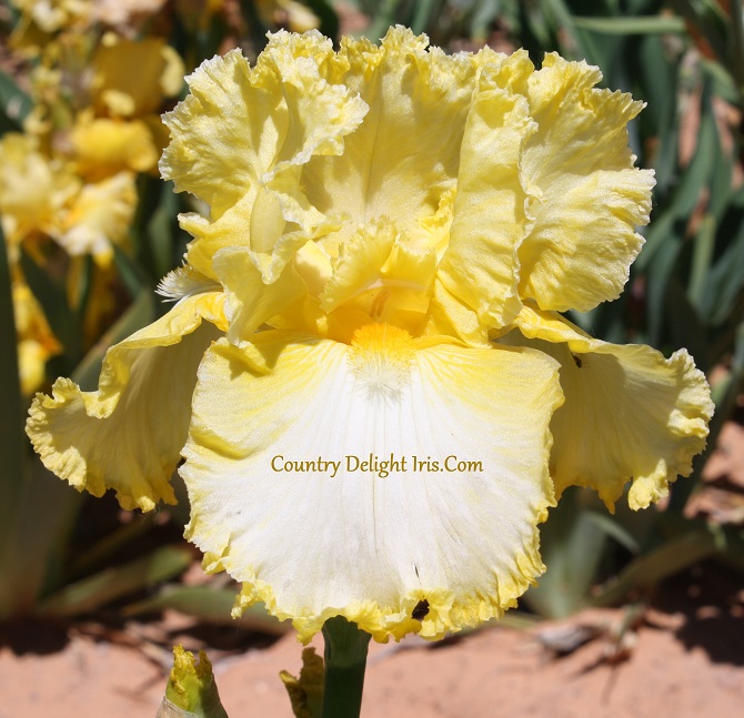 ‘Brocaded Gown’ (Chet Tompkins, R. 1989). TB, 38″ (97 cm), Late midseason bloom. Ruffled ivory flushed lemon, edged cream, gilt lace; self beard. Fleur de Lis 1988. Honorable Mention 1990.