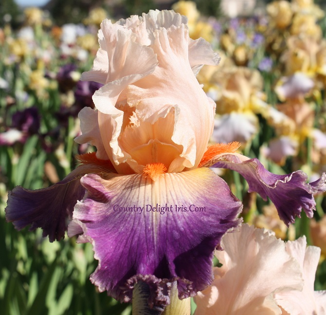 By Popular Demand’ (Paul Black, R. 2006). TB, 37″ (94 cm), Midseason to late bloom. Standards buffy peach-pink, paler toward edge, gilt gold halo around edges; style arms peach; falls peach pink center veined red purple, shading and sanding to velvety red-purple, light peach rim, darker peach center stripe from beard to purple area; beards tangerine; ruffled, lightly laced; slight sweet fragrance. Mid-America 2006.