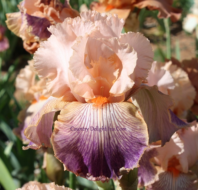 ‘Carnival Carousel’ (James Begley, R. 2003) TB, 38″ (97 cm). Midseason bloom. Standards orient pink, cool lavender pink central flush; style arms orient pink; falls dark rose purple lining entire length of petal, becoming solid wash on lower third, clear apricot wire rim, cinnamon shoulders; beards mandarin red, large, bushy; ruffled, laced; slight spicy fragrance. My Wild Iris Rows 2005. Honorable Mention 2007.