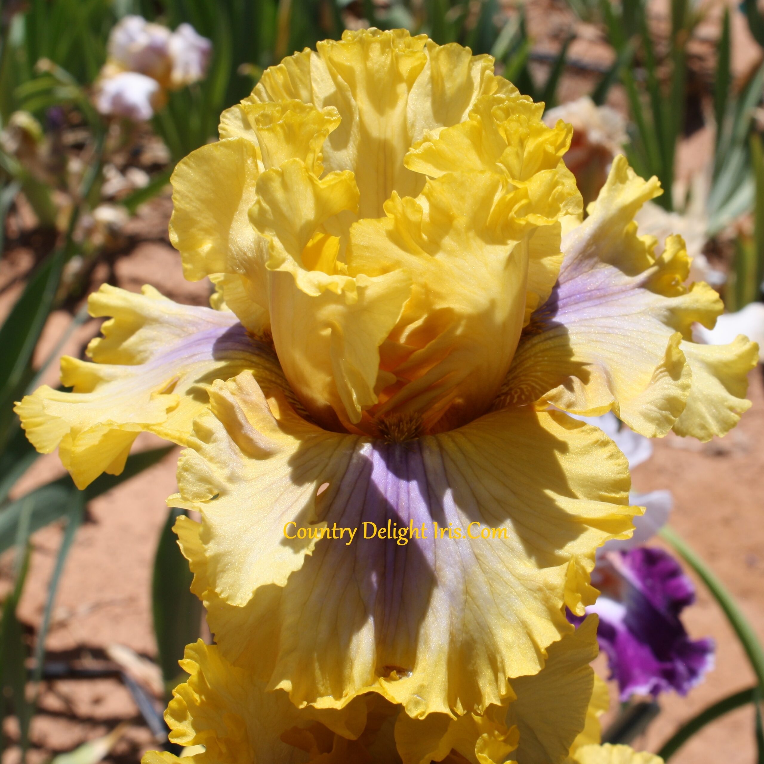 ‘Cherished Memories’ (Richard Tasco, R. 2022), TB, 35″ (89 cm), Late bloom. Standards golden yellow; style arms same, purple crests; falls same, violet blaze down middle of petals; beards rust. Superstition Iris Gardens 2023. Honorable Mention 2025.