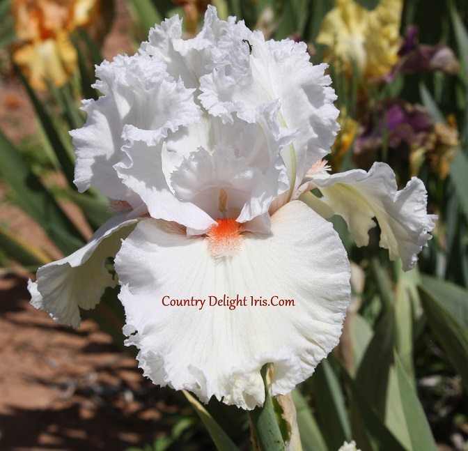 Christmas Ice’ (Oscar Schick, R. 2003). TB, 37″ (94 cm), Midseason bloom. Heavily laced white self; falls with very light beige deep in base; beards chinese red, white at end; slight musky fragrance. Lauer 2004.