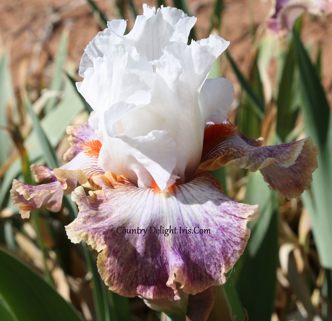 ‘Colours Of The Wind’ (Barry Blyth, R. 2014). TB, 34″ (86 cm). Early to midseason bloom. Standards white; falls cream, overlay of apricot-beige and further overlay of light violet veining and dots, lighter around beards; beards vivid red; slight sweet fragrance. Tempo Two 2014/15