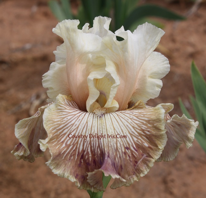 ‘Crazy For You’ (Barry Blyth, R. 1998).  TB, 36″ (91 cm), Early midseason bloom. Standards oyster grey, pinkish beige midrib flush; falls oyster grey overlaid and heavily veined rose grey, 1/8″ oyster grey edge; beards white, hairs tipped bronze tangerine; sweet fragrance. Tempo Two 1998/99