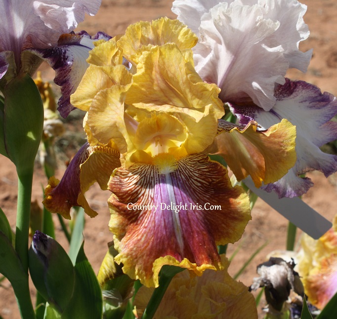 ‘Elmer’s Web’ (Lorna Morrison, R. 2001. TB, 37″ (94 cm), Midseason bloom. Standards gold, slight red in veins; style arms yellow; falls yellow overlaid violet, maroon webbing at sides, center stripe white, laced and ruffled yellow border; beards white at end, yellow, orange in throat; slight spicy fragrance. Sand Hollow 2002.