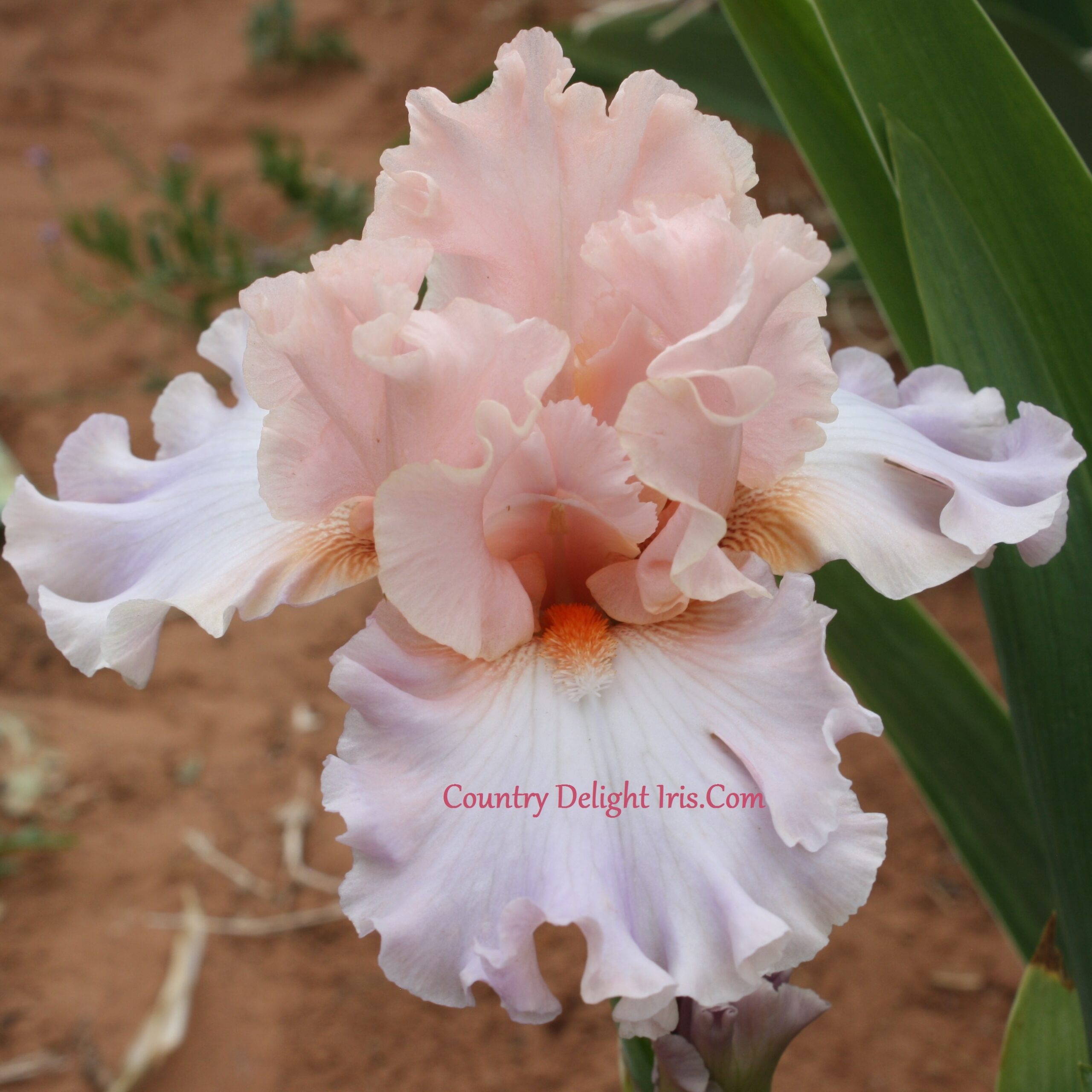 ‘Epic Romance’ (Barry Blyth, R. 2017) TB, 34″ (86 cm). Very, very early bloom. Standards peach, blended to lemon-peach on outer parts; Falls white with lavender overlay, ¼˝ creamy buff edge; beards vivid tangerine; slight fragrance. Mid-America 2019.