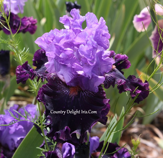 ‘Fabric Of Dreams’ (Barry Blyth, R. 2011).  TB, 33″ (84 cm). Late midseason bloom. Standards light lavender-violet; falls rich black-violet, lighter at rich burnt bronze beard; pronounced sweet fragrance.  Tempo Two 201112.