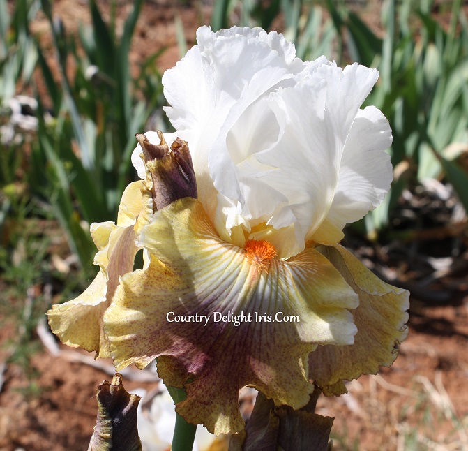‘Fantasy Ride’ (Roger Duncan, R. 2009). TB, 39″ (99 cm). Early to midseason bloom. Standards diamond dusted cold white, light lemon yellow deep at base; style arms cold white, some bright yellow fringing on crest; falls cold white, buttercup yellow and white veining on top half, bottom half sanded spectrum violet darkening to pansy violet at end, lemon yellow rim dotted violet on bottom, white rim without dots on sides; beards hot indian orange; lightly ruffled; light purple base foliage; slight sweet fragrance. Superstition 2009. Honorable Mention 2013.