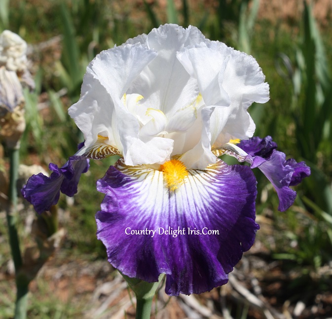 ‘Flash Of Light’ (Thomas Johnson, R. 2008). TB, 36″ (91 cm), Late bloom. Standards white, hint of blue surround; style arms white, crests tipped gold; falls dark blue, large white blaze around bright gold-yellow beard; ruffled; slight sweet fragrance. Mid-America 2008. Honorable Mention 2010.