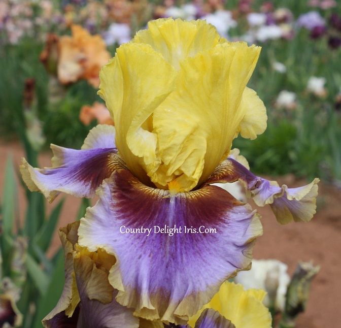 ‘Gypsy Lady’ (Thomas Johnson, R. 2012). TB, 37″ (94 cm). Late midseason bloom. Standards lemon yellow, deeper in center; falls light lavender, deeper below beards, dark red-purple shoulder, light yellow rim; beards yellow orange; slight fragrance. Mid-America 2012. Honorable Mention 2014; Award of Merit 2016.
