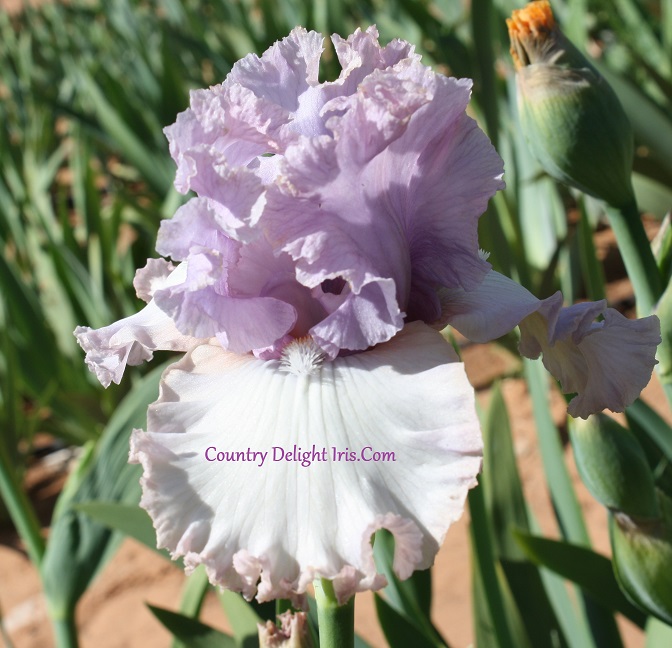 ‘I Like Pretty Things’ – (Paul Black, R. 2017)  TB, 33″ (84 cm), Early-Midseason bloom. Standards mid greyed lilac blending lighter to silvery white edge; style arms mid greyed lilac, silvery lilac crests; Falls palest opaque lilac, darker textured veins, narrow mid-light mallow-pink band; beard hairs based light lilac, tipped mid coral-pink in throat, light coral-pink in middle, ends ice white; ruffled; laced; slight sweet fragrance.  Mid-America 2017. Honorable Mention 2019Award of Merit 2023.