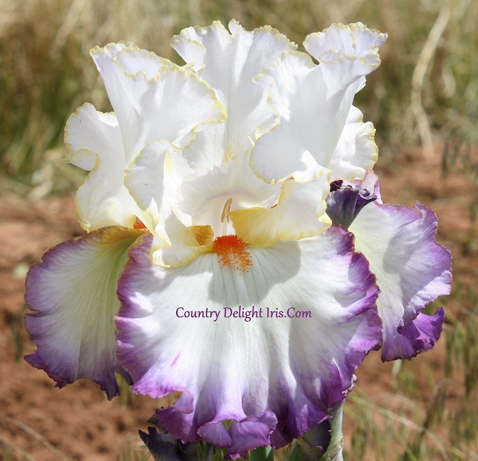 ‘In The Loop’ (Joseph Ghio, R. 2013).  TB, 40″ (102 cm), Early midseason bloom. Standards white, cream halo; falls white, precise red-violet band; beards red. Bay View 2014. Honorable Mention 2017.