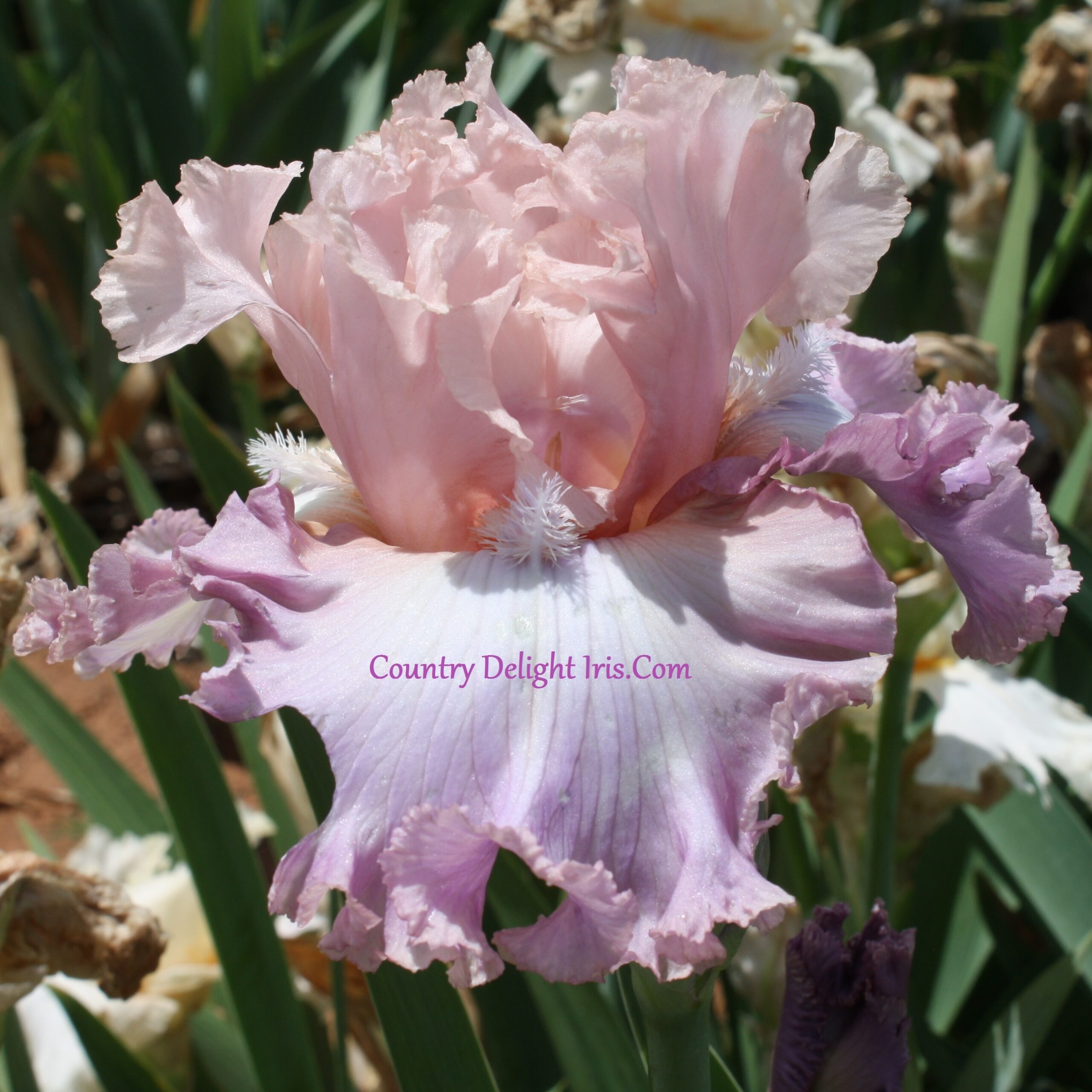 ‘Lace Point’ (Michael Sutton, R. 2018). TB, 33″ (84 cm), Midseason to very late bloom. Standards orchid pink, lavender flush at midribs, edged honeysuckle; style arms orchid pink; falls. white blending to lavender, grey-orange shoulders; beards tangerine in throat, middle pale tangerine, ends lavender, fuzzy lavender horns; heavily laced; slight sweet fragrance. Sutton 2018.