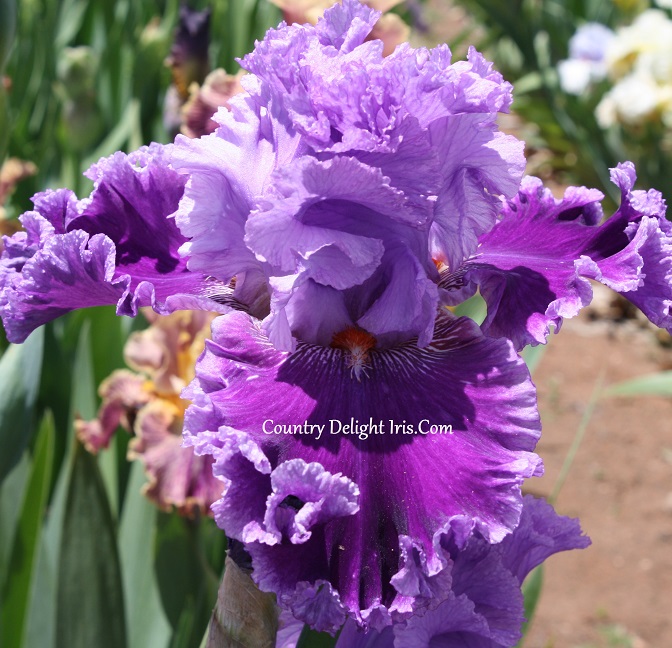Louisa’s Song’ (Barry Blyth, R. 1999). TB, 42″ (107 cm). Early to midseason bloom. Standards lilac orchid; falls red lavender to orchid lavender, 1/4″ blended lilac orchid edge; beards bright tangerine; ruffled, laced; slight sweet fragrance.  Tempo Two 1999/2000.