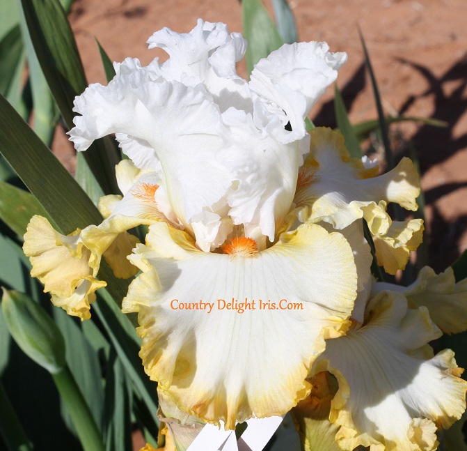 ‘Made In Heaven’ (Barry Blyth, R. 2015) TB, 33″ (84 cm). Very early bloom. Standards white; falls creamy white, ¹⁄₈˝ creamy yellow edge, reverse yellow; beards white, heavily tipped tangerine. Tempo Two 1016/17.