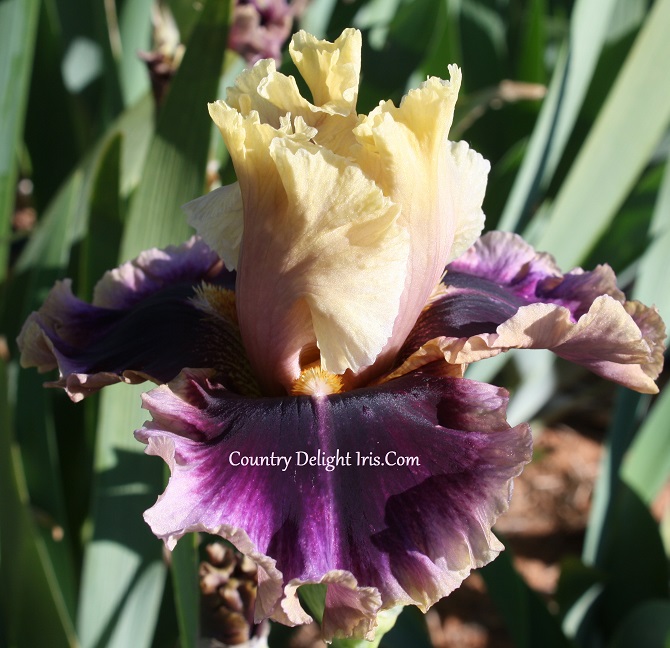 ‘Make Mine Magic’ (Barry Blyth, R. 2012). TB, 34″ (86 cm). Early midseason bloom. Standards creamy beige, soft burgundy blush at midrib; falls burgundy-violet with 3/8″ beige edge; beards cream tipped tangerine; pronounced sweet fragrance. Tempo Two 2012/13.