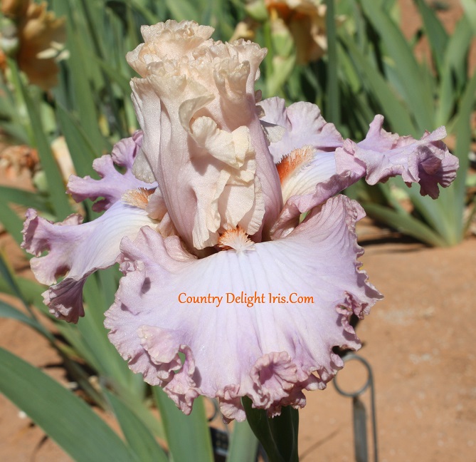 ‘Mandolin Wind’ (Barry Blyth, R 2010). TB, 33″ (84 cm), Late midseason bloom. Standards pastel creamy peach; falls pastel pink, faint lavender cast, tan hafts, creamy peach wire edge; ruffled to laced; beards tangerine orange; pronounced sweet fragrance. Tempo Two 2010/11.
