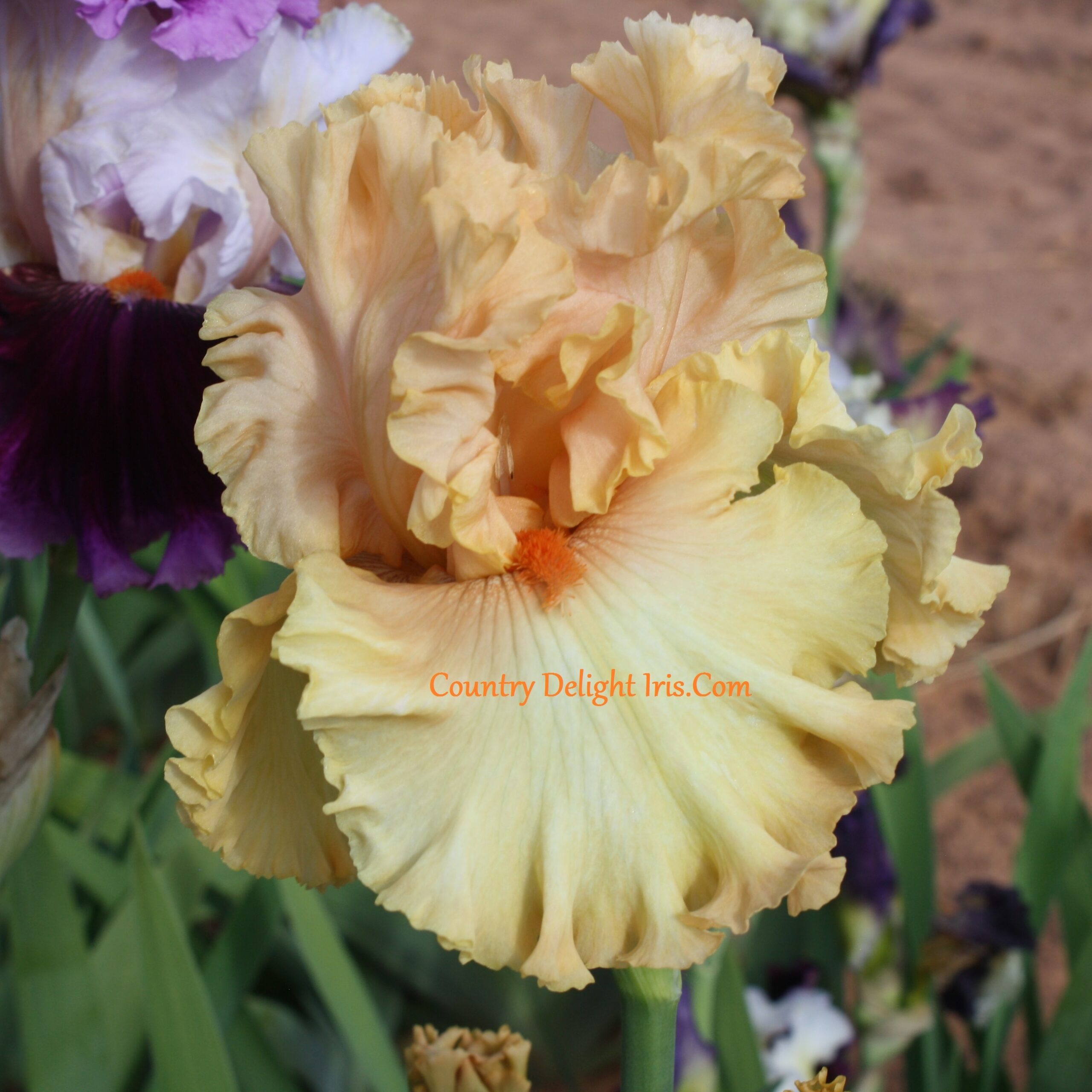 ‘Mango Dream’ (Michael Sutton, R. 2019). TB, 33″ (84 cm), Early to midseason bloom. Standards peach-pink, lemon-yellow at edge; style arms peach-pink; falls pale greyed yellow, white area below beard, mars orange shoulders around beard, ½˝ apricot rim on bottom half of petal; beards fire red; ruffled; sweet fragrance. Sutton 2019.