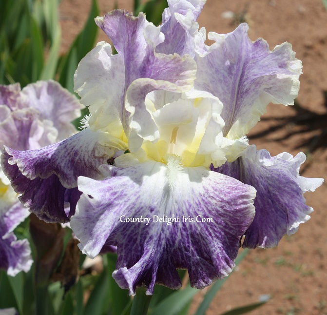‘Moonlit Water’ (Keith Keppel, R. 2004). TB, 36″ (91 cm), Early thru late bloom.Standards greyed violet lighter towards center, lemon to greenish lemon edges and base; style arms white, to greenish lemon, flushed lavender blue; falls blue violet shaded darker, large white area around beard, hafts edged lemon, pale agate grey rim; beards cream at end, lemon middle, orange yellow in throat.  Keppel 2005. Honorable Mention 2007.