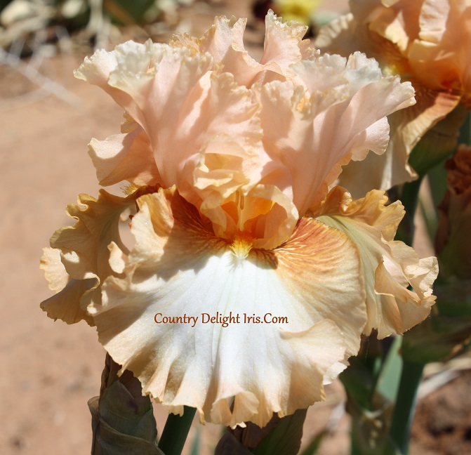 ‘Orange Toffee’ (Michael Sutton, R. 2010) TB, 33″ (84 cm), Early midseason bloom and rebloom. Standards greyed orange flushed pink at midribs; style arms greyed orange falls pale violet, greyed orange veins and edges, burnt toffee at shoulders; beards carrot; heavily ruffled and laced. Sutton 2011.