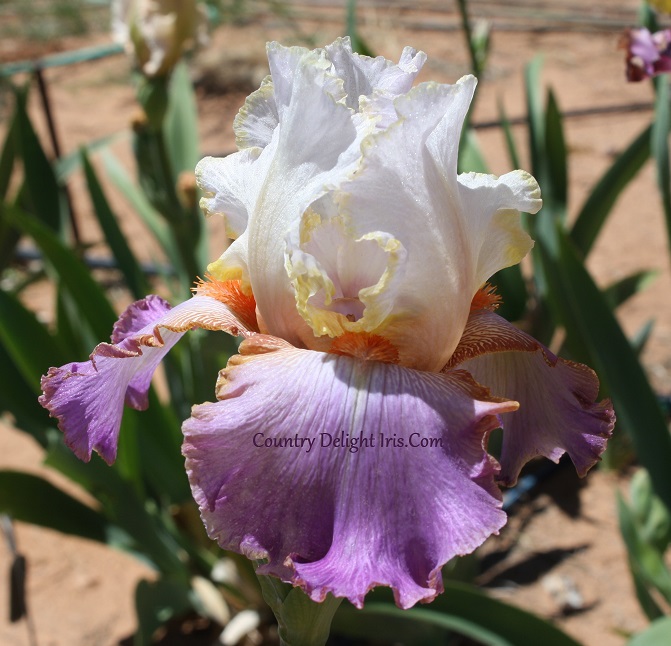 ‘Orion’s Gate’ (Ginny Spoon, R. 2006).TB, height 33″ (84 cm). Midseason bloom. Standards yellow, lavender at base and midrib; style arms deeper yellow; falls lavender, old gold hafts and shoulders, lighter zone below golden yellow beards; ruffled, fluted, flared, laced.  Winterberry 2006.