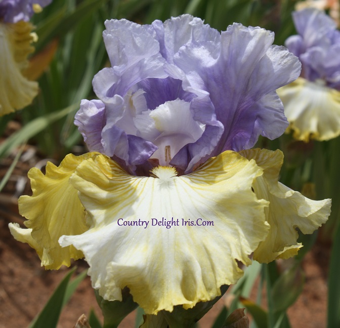 ‘Party’s Over’ (Duane Meek, R. 2005) TB, 34″ (86 cm). Early midseason bloom. Standards soft lavender blue, midrib deeper; style arms pale lavender around blue stigmatic lip; falls ivory, faintly flushed lavender around beard, hafts yellow; beards ivory, hairs tipped pale yellow; ruffled. D. & J. Gardens 2005.