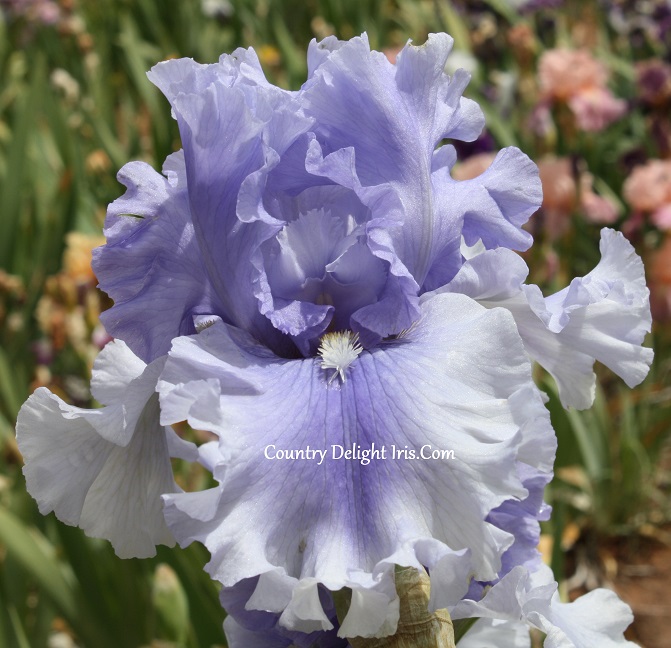‘Raging Tide’ (Keith Keppel, R. 2006). TB, 38″ (97 cm). Midseason to late midseason bloom. Standards blue, edged darker ; style arms pale blue; falls medium violet-blue center, 11/2″ outer area pale blue; beards blue white tipped lemon, white tipped lemon in throat; very ruffled. Keppel 2007. Honorable Mention 2009.