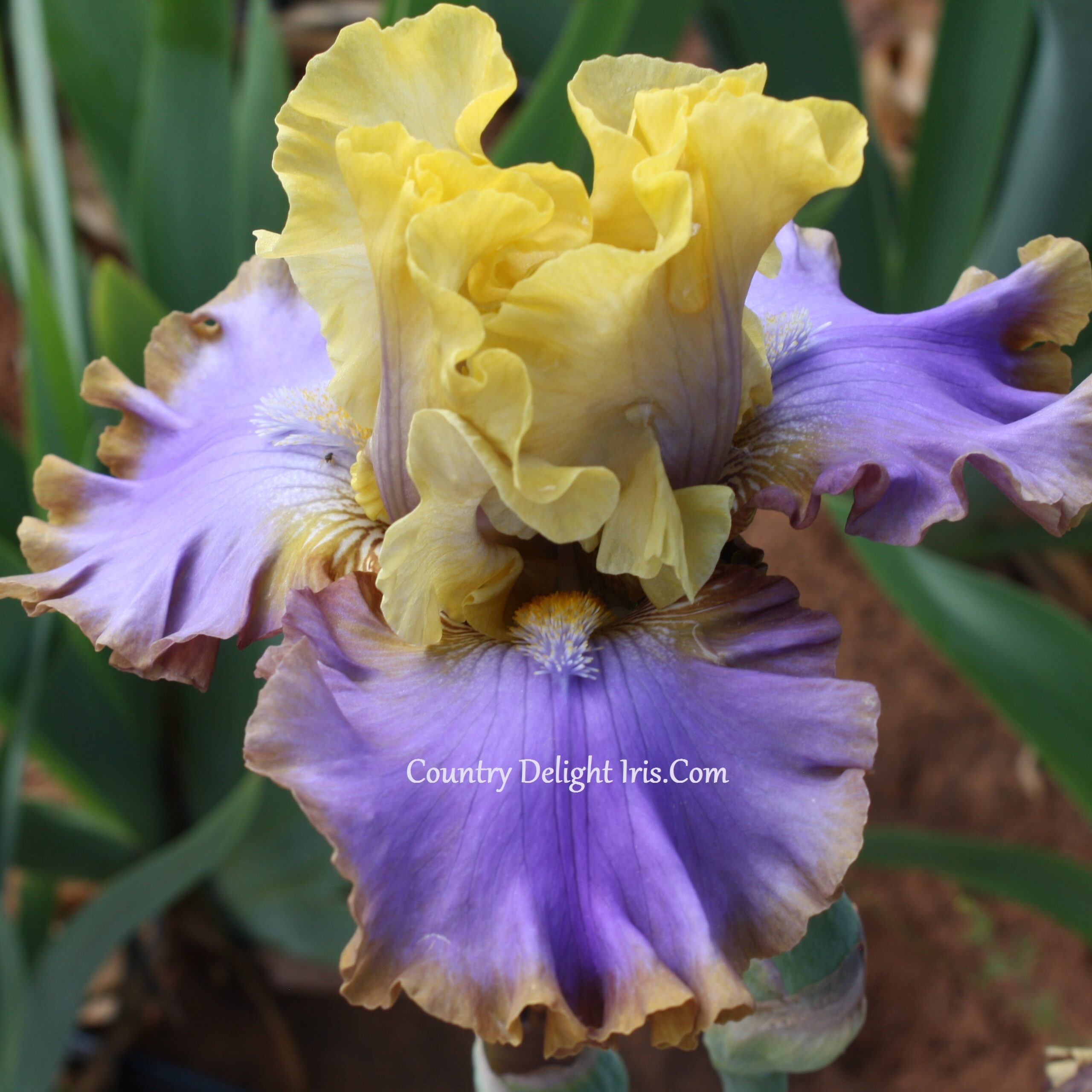 ‘Repertoire’ (Thomas Johnson, R. 2011 ). TB , 35″ (89 cm) , Late bloom. Standards medium yellow-green shaded slate violet up midrib; style arms buff sides and crests, violet midribs; falls pastel violet, gold to brown hafts, precise old gold bands; beards yellow orange; ruffled; sweet fragrance. Mid-America Gardens 2011.Honorable Mention 2014