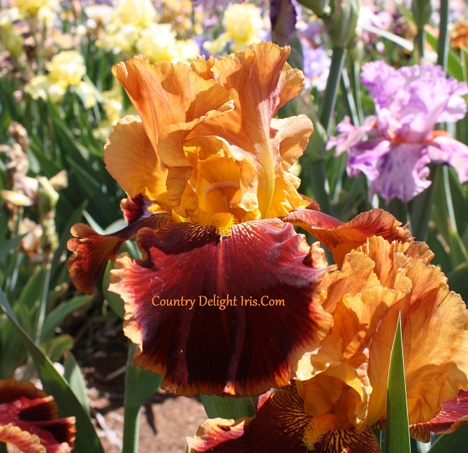 ‘Rush Creek’ (Jack Worel, R. 1999). TB, 32″ (81 cm), Midseason bloom. Standards rose, midrib and very thin edge yellow gold; style arms lighter rose, edge brownish yellow; falls rust red, 1/8″ yellow gold edge, slight white area marked rust red around gold beard; slight sweet fragrance. Holly Lane 1999. Honorable Mention 2002.