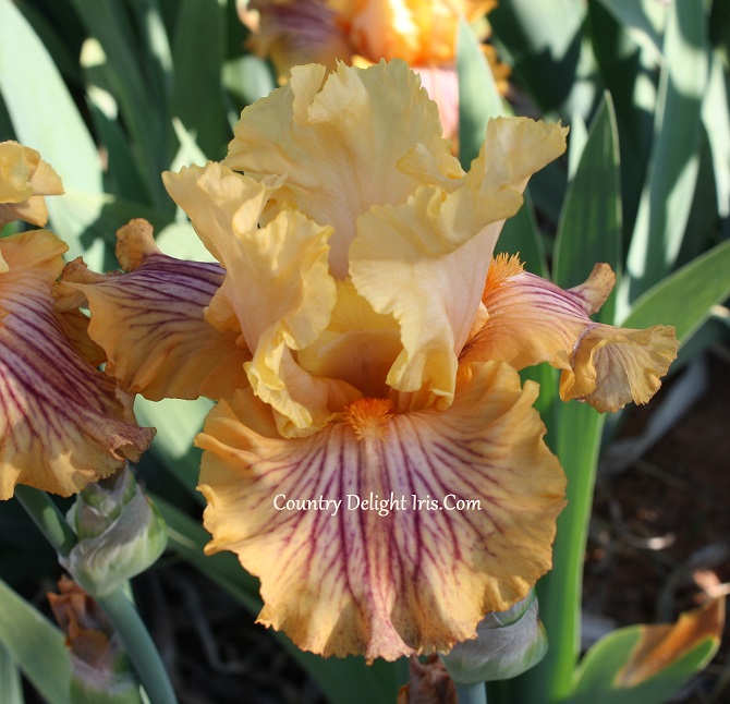 ‘Sammie’s Jammies’ (Tom Burseen, R. 2009).  TB, 35″ (89 cm). Midseason bloom. Standards and style arms cadmium orange; falls yellow ochre, creamy yellow centers covered in red purple veins; beards tangerine orange; blocky, ruffled, laced; slight spicy fragrance. . Burseen 2010. Honorable Mention 2012;, Award of Merit 2014.