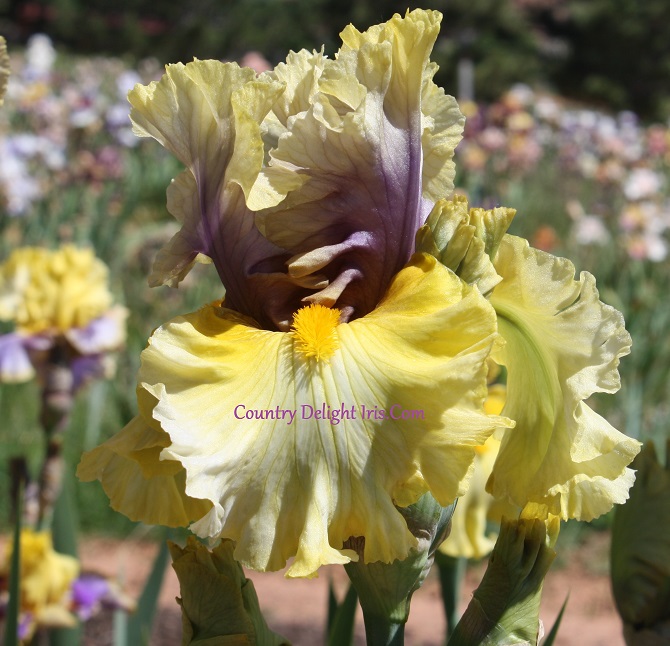 ‘Secret Rites’ (Keith Keppel, R. 2004). TB, 40″ (102 cm). Midseason bloom. Standards pale grey green, brighter chartreuse yellow (11-I-1) edge shading, greyed violet center; style arms chartreuse yellow; falls chartreuse yellow shaded citron yellow and pyrethrum yellow; beards golden glow to deep chrome yellow; slight sweet fragrance. Keppel 2005. Honorable Mention 2007, Award of Merit 2010.