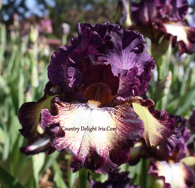 ‘Select Circle’ (Joseph Ghio, R. 1996). TB, 38″ (97 cm), Early to late bloom. Standards blackish plum dotting and stitching on white; falls white, edges dotted and stitched blackish plum; beards brick, purple at end. Bay View 1997. Honorable Mention 1999Award of Merit 2003.