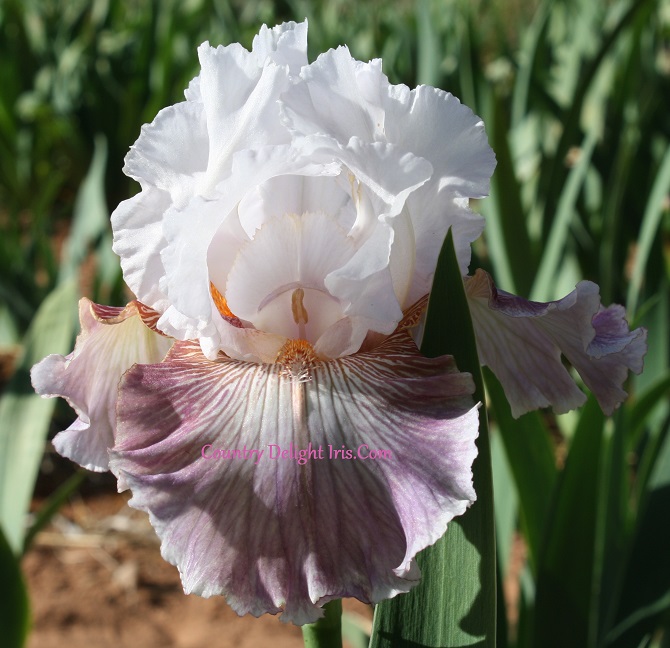‘Sharp Edge’ (George Sutton, R. 2010).  TB, 31″ (79 cm). Early to late bloom. Standards and style arms white; falls white washed and veined mallow purple, white edges; beards white base, hairs tipped yellow orange in throat and middle, tipped mallow purple at end; ruffled, serrated edges; slight sweet fragrance.  Sutton 2011.
