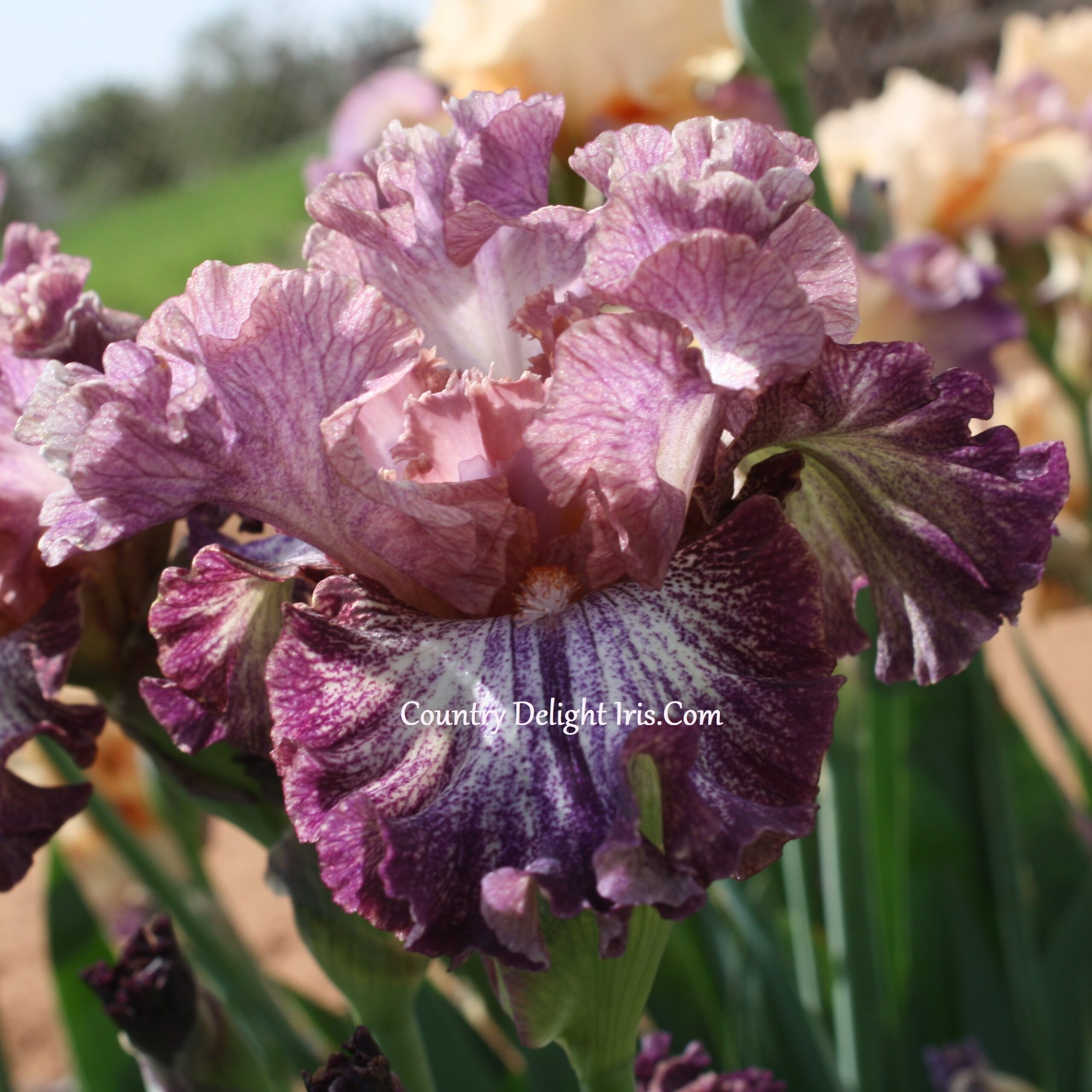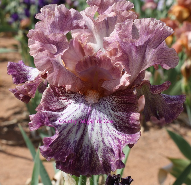 ‘Shiralee’ (Barry Blyth, R. 1988). TB, 36″ (91 cm), Midseason bloom. Standards lavender pink, lightly plicata veined; falls white, deeper lavender rose edging and center line; white beard tipped pale tangerine.  Tempo Two 1988/89.