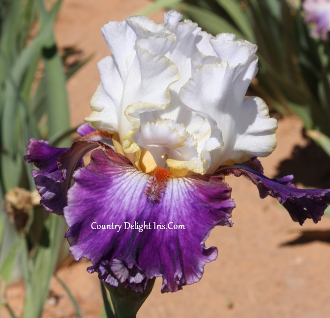 ‘Some Enchanted Evening’ (Bruce Filardi, R. 2004).  TB, 41″ (104 cm), Late midseason bloom. Standards pale blue violet, fading to blue white, gilt rim; style arms pale blue violet with pronounced brownish laced edge; falls bright dark purple, small white area around beard surrounded by wine colored transitional area, narrow white rim; beards brick orange, end pale orange base blue; slight spicy fragrance. Aitken 2006. Honorable Mention 2008.
