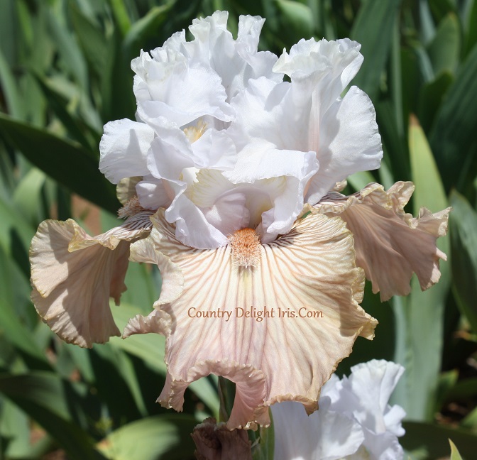 Tango Amigo’ (Barry Blyth, R. 2007). TB, 36″ (91 cm). Early bloom. Standards icy pink-white deepening to soft pink at midrib; falls light coffee-chartreuse, all over deeper coffee brown veining; beards coffee pink.  Tempo Two 2007/08.