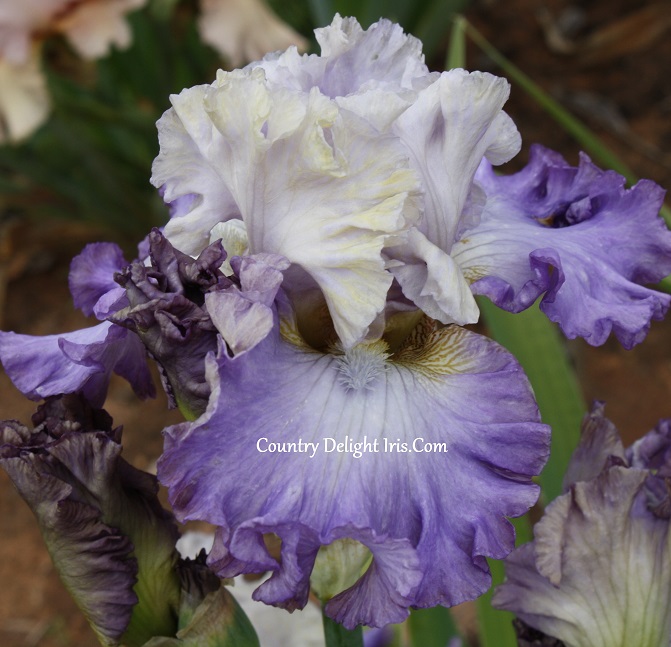 ‘Tango To The Moonlight’ (Ben Johnson, R. 2008). TB, 32″ (81 cm). Midseason bloom. Standards creamy tan, some lavender influence, yellow highlights at base, ruffled; style arms pale lavender, yellow crests; falls medium lavender deepening toward edges, paler near beards, thin edge of smoky plum, wide smoky plum border on reverse, bubble ruffled; beards very pale lavender, yellow in throat; slight sweet fragrance. Rockytop 2011. Honorable Mention 2015