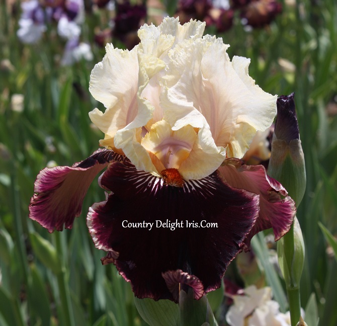 ‘Taste The Magic’ (Barry Blyth, R. 2004). TB, 38″ (97 cm). Early to midseason bloom. Standards oyster creamy white with an overlay of soft peach at midrib, spreading about halfway over petal, some peach veining over the remainder; falls deep cherry-black with 3/16″ defined edge of standards color, few striking white lines at base; very bright tangerine beard. Keppel, Tempo Two 2006, 2006/07.