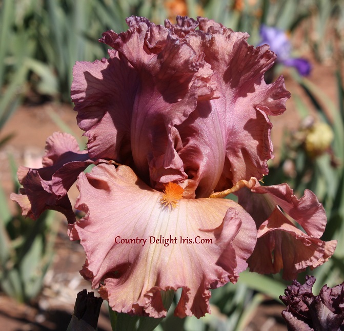 ‘Terracotta Bay’ (Barry Blyth, R. 2005). TB, 40″ (102 cm). Late midseason bloom. Sienna terracotta self, falls have slightest lavender flash below beard; beards bright tangerine-orange. Tempo Two 2005/06.