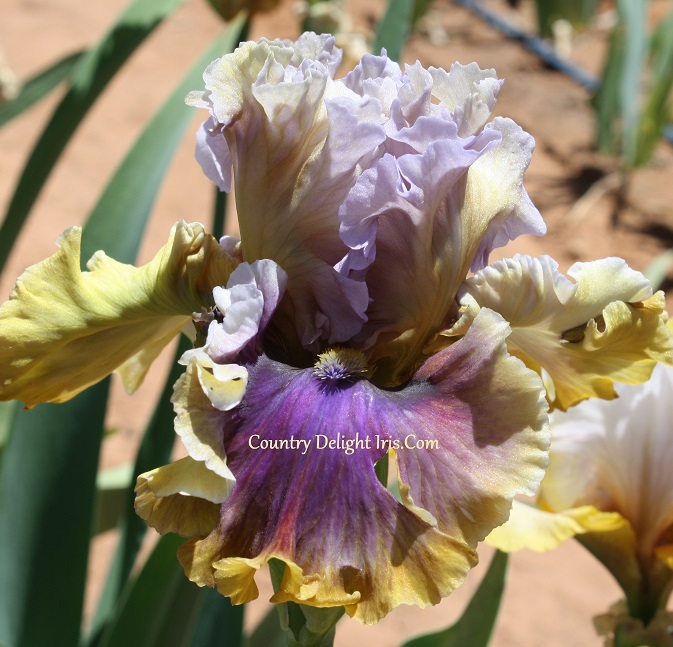 ‘The Majestic’ (Anton Mego, R. 2016). TB, 38″ (97 cm). Midseason bloom. Standards wisteria blue, greyed yellow veining and flush at midribs; style arms wisteria blue, crests greyed yellow; falls red-violet with purple highlights, ½˝ wisteria blue edge on top half of petal, ½˝ greyed yellow edge on botton half of petal; beards yellow; heavily ruffled; slight sweet fragrance.  Sutton 2017.
