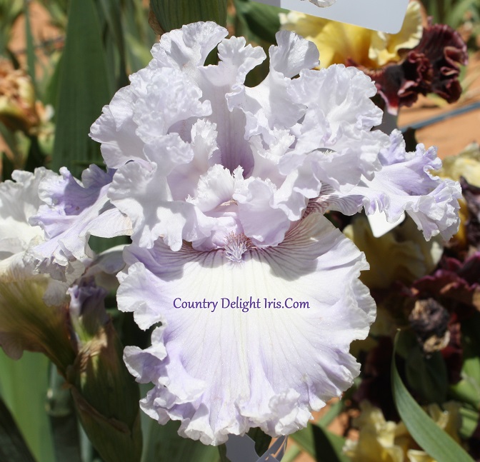 ‘Treasure Bay’ (Thomas Johnson, R. 2019). TB, 37″ (94 cm), Late bloom. Standards and style arms icy blue-white; falls blue-white centers, light to medium lavender-violet wash ending in a ruffled clean ice white edge; beards frosted blue; musky fragrance. Mid-America 2019.