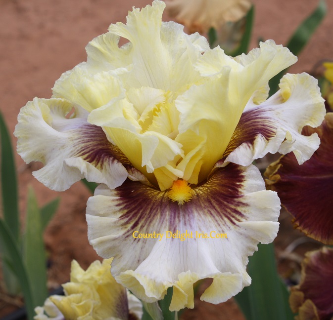 ‘Truth Or Dare’ (Thomas Johnson, R. 2018). TB, 36″ (91 cm), Late bloom. Standards lemon-yellow, deeper at base; style arms lemon; falls white, faint yellow band near edge, rusty red blaze in center; beards tangerine; slight fragrance. Mid-America 2018. Honorable Mention 2021; Award of Merit 2023.