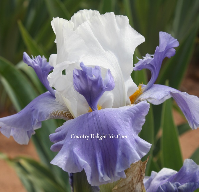 ‘Twilight Serenade’ (LeRoy Meininger, R/ 2001). TB, height 34″ (86 cm). Midseason bloom. Standards white; style arms white with faint violet flush; falls blue violet, irregular 1/4″ pale violet border; beards orange, prominent 1 ” violet appendage with large violet spoon. Monument, Woodland 2001.
