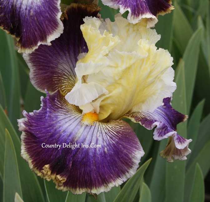 ‘Twin Cities’ (Michael Sutton, R. 2009).. TB, 34″ (86 cm). Late midseason bloom. Standards chartreuse veined and edged white; style arms yellow; falls white around beards blending to violet-blue starburst which becomes plum purple, 1/4″ pale violet-blue rim on upper half, golden tan rim on lower half of petal; beards orange in throat, old gold in middle, lavender at end; serrated; slight spicy fragrance. .Sutton’s Iris Gardens 2011.
