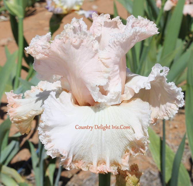 ‘Unfailing Love’ (Michael Sutton, R. 2020) TB, 35″ (89 cm), Midseason to late bloom. Standards pale pink, slight verdigris veining; style arms white, pink at crests; falls white, pink in throat; beards tangerine in throat and middle, ends lavender; ruffled; heavily laced; pronounced sweet fragrance. Sutton 2021.