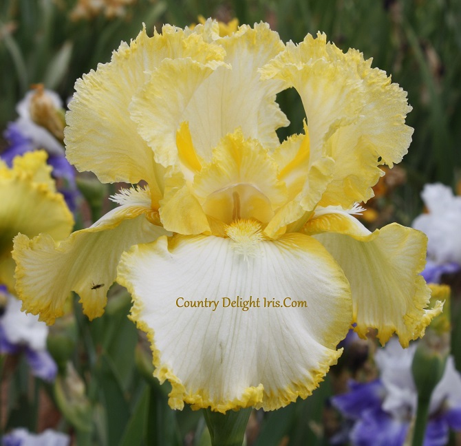 ‘Victorian Pleasures’ (Robert Van Liere, R. 2008) TB, 34″ (86 cm), Midseason bloom. Standards yellow, lighter edges; style arms darker yellow; falls white, yellow edges; beards dark yellow in throat, light yellow in middle, white at end; picotee edges standards and falls.Iris 4 U 2009.